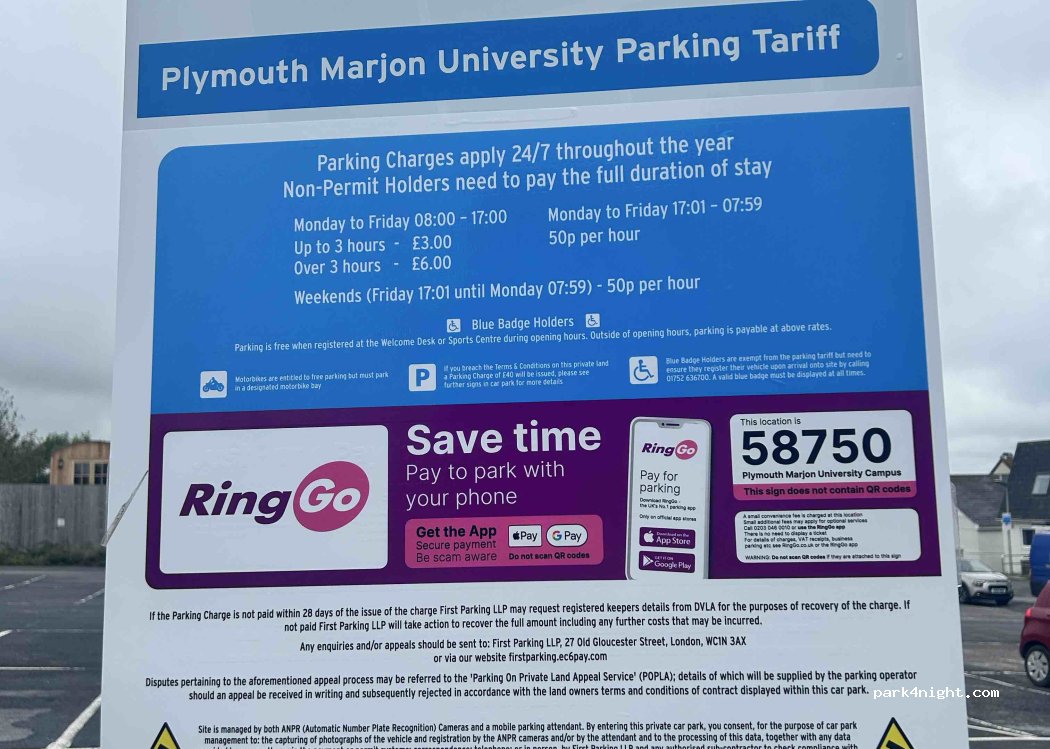 University campus paid parking. The campus is always open meaning you can use the facilities like toilets and water fountains. There is also a shop on campus stocked by COOP