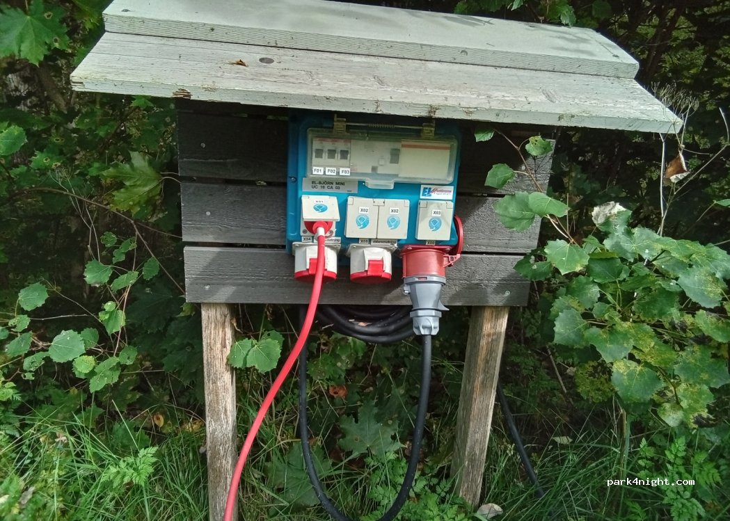 Es gibt ein Verkehrschild das ausdrücklich diesen Platz für Wohnmobile ausweist. Es ist im Dorf, aber umgeben von Wiese und Bäumen. Etwas Verkehrslärm. Ich habe hier meine Batterie aufgeladen. Es gibt frei zugängliche Steckdosen mit Schuko und Rote für Drehstrom, welche ich aber nicht testen konnte. Vielleicht nicht kostenfrei, siehe Bild.