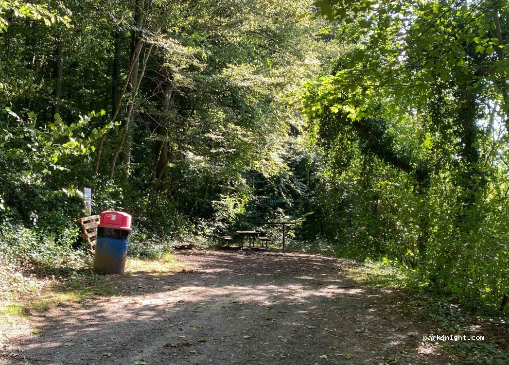 Small barbecue area with table and trash can. No indication that prohibits staying the night. Quiet but still overlooking a small road with very little traffic.