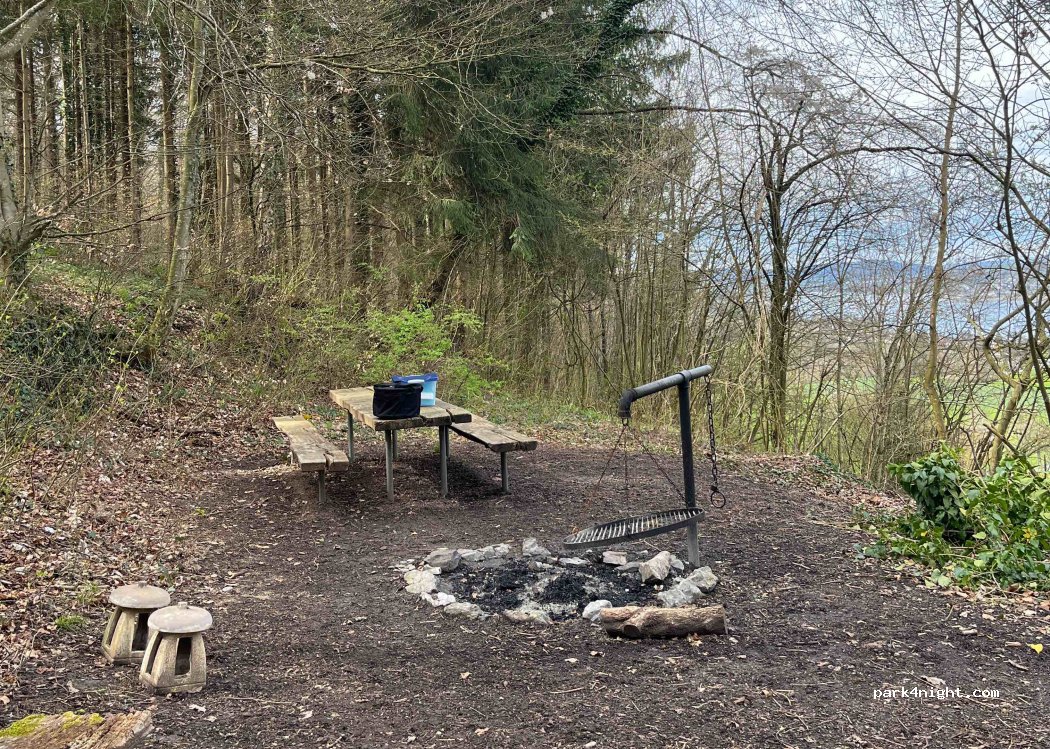 Kleiner Grillplatz mit Tisch und Mülleimer. Kein Hinweis, der das Übernachten verbietet. Ruhig, aber dennoch mit Blick auf eine kleine Straße mit sehr wenig Verkehr.