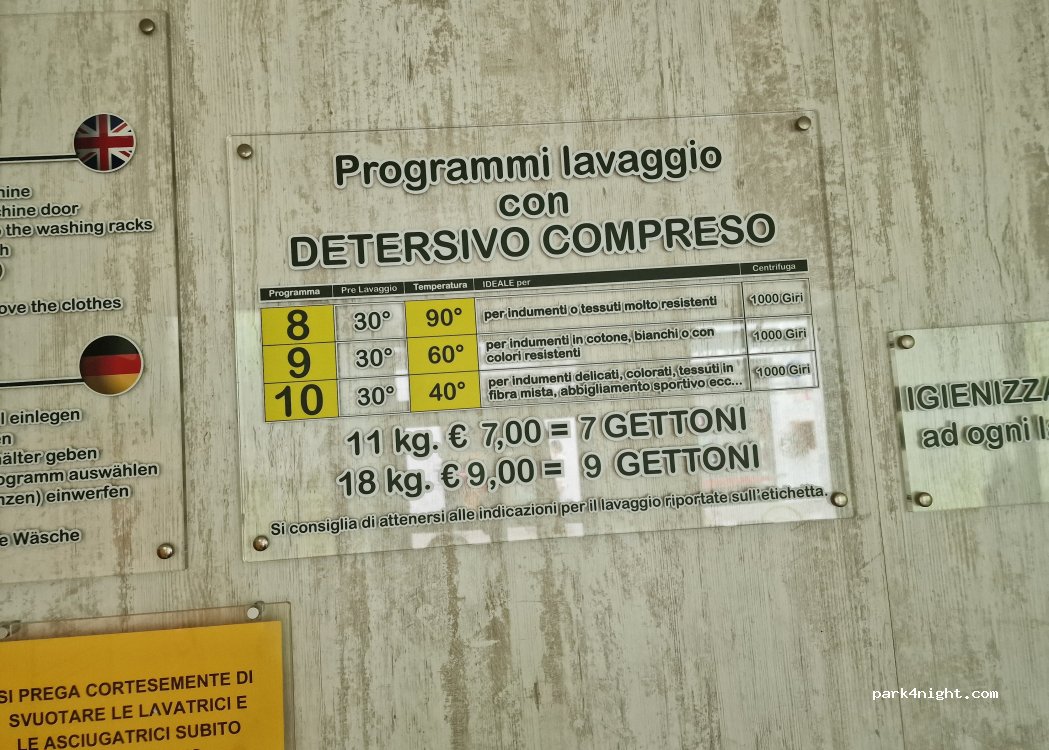 Machine à laver 4 euro la petite et 7 la grosse, pièce à échanger contre des jetons, lavage en 25 minutes 5 minute en vélo du parking camping-car à côté du supermarché conad