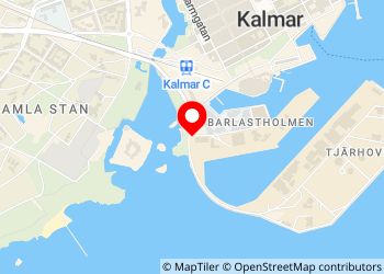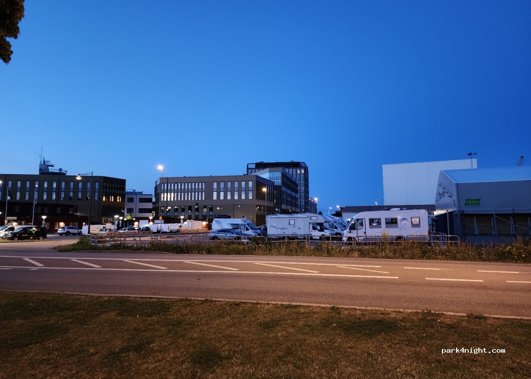 Parking lot with free parking 18:00-9:00, no visible prohibition against overnight parking and plenty of RVs parked there. Wonderful view of Kalmar Castle. There is a hose with fresh water across the street in the guest harbor but you cannot drive to it.