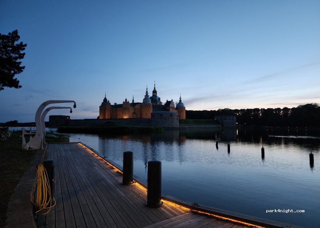Parking avec parking gratuit de 18h00 à 9h00, aucune interdiction visible de stationner la nuit et de nombreux camping-cars y sont garés. Magnifique vue sur le château de Kalmar. Il y a un tuyau d'eau douce de l'autre côté de la rue dans le port des invités, mais vous ne pouvez pas vous y rendre en voiture.