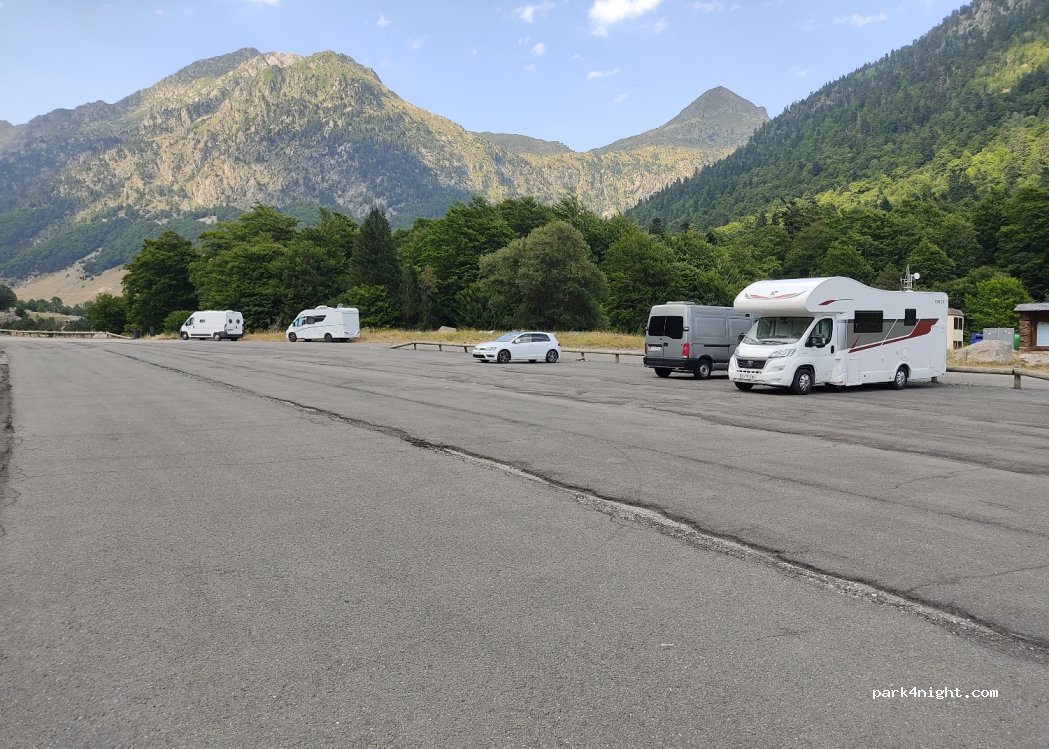 Service area just before entering the tunnel towards Vielha, there were several trucks staying overnight. We slept well and were not disturbed by road traffic. Following the track, a little further down is the parking lot and recreational area of Conangles, but overnight stays are not allowed. From here there are good hiking trails.