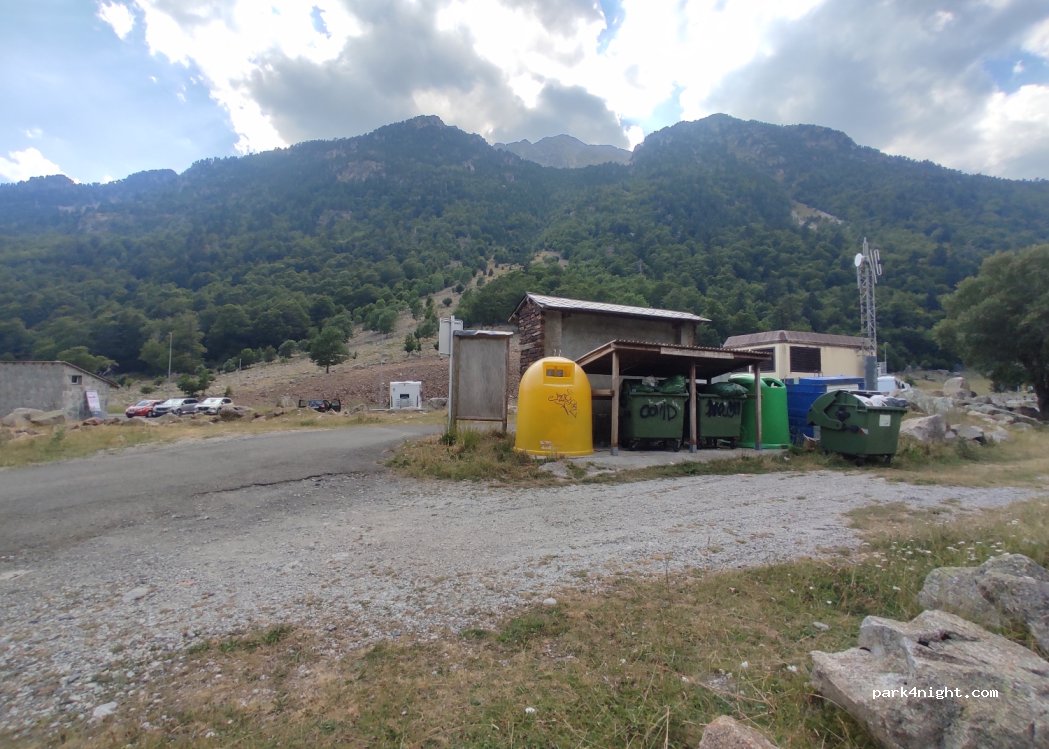 Parking grande. Espacio familiar con zona de picnic y sombra. Pasa el río al lado del parking y había familias bañándose. Salida de varias rutas, incluyendo al Estany de Besiberri (precioso). No hemos pernoctado porque hay un aviso de prohibido la pernocta de cualquier tipo de vehículo.