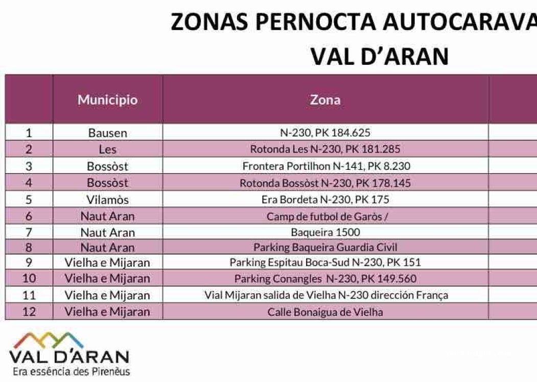 Área de servicio justo antes de entrar al túnel dirección Vielha, había varios camiones pernoctando. Dormimos bien y no nos molestó el tráfico de la carretera. Siguiendo la pista, un poco más abajo esta el aparcamiento y área recreativa de Conangles pero no está permitida la pernocta. Desde aquí salen buenas rutas de senderismo.