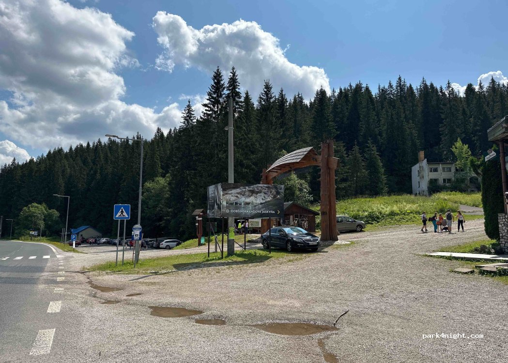 Parking pour visiter les grottes glaciaires de Dobšinská L'adová Jaskyña. Et départ des randonnées dans le Parc National du Paradis Slovaque. Toilettes payantes à côté du point info.