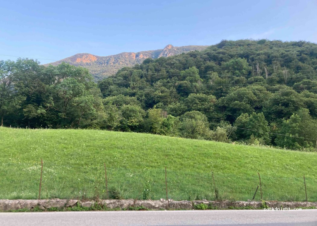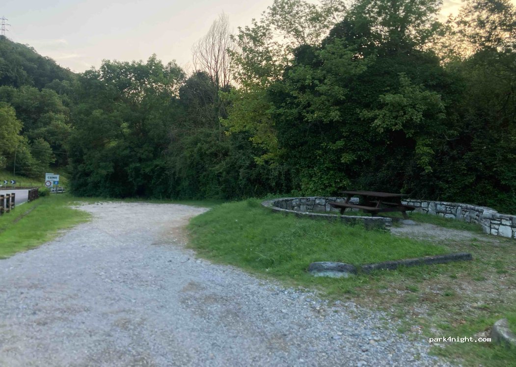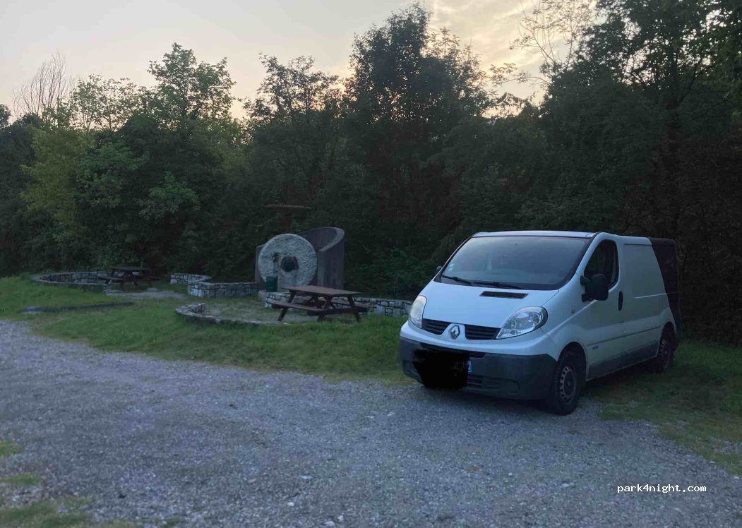 Aire de pique nique proche de la route, nous avons passé une nuit à cet emplacement, et avions trouvé une place au plat. Plus de bruit des voitures à partir de 22h. 2 tables de pic niques, une poubelle. Top !