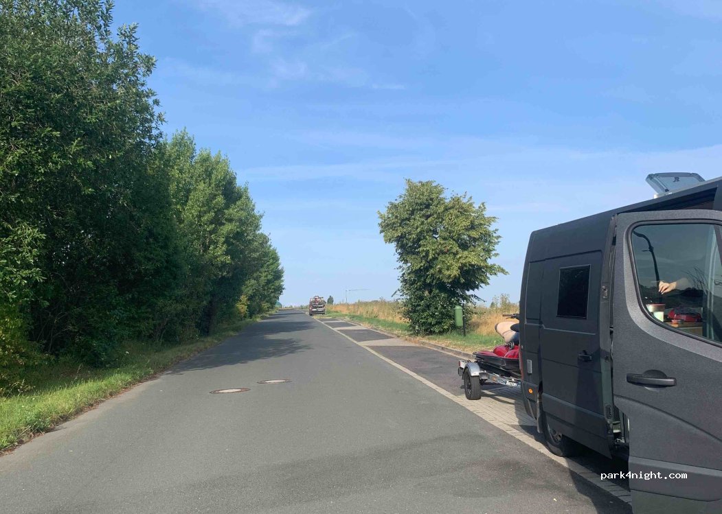 Kostenloser Stellplatz neben dem Autohof. Die Straße ist wenig befahren.