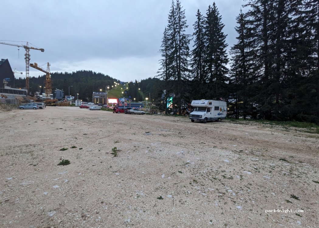 Huge free gravel parking at the entrance of the Jahorina Village. We stayed here for two nights during Jahorina Ultra Trail 2023. Place is quite and calm during the night. There are several not too steep spots. One of the routes to the mountains starts right from this parking.