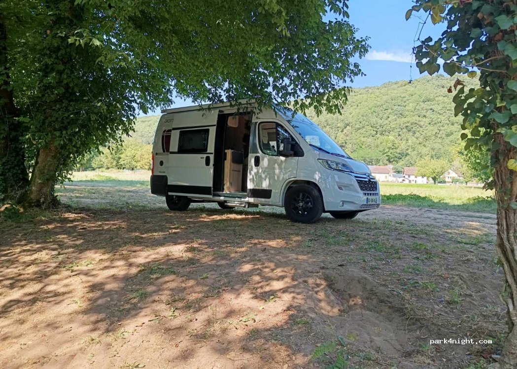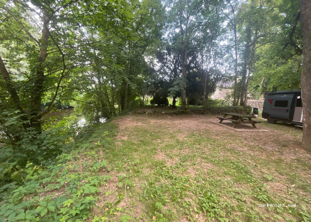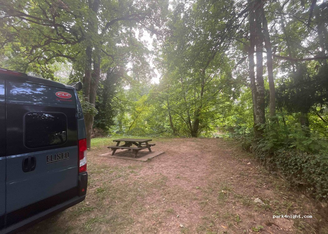 Aire de pique nique, accès fourgon / van, 1 place. Endroit très calme surplombant la rivière. Endroit propre avec poubelle et 1 table de pique nique. Possibilité de passer une nuit, pas de barrière. Je recommande