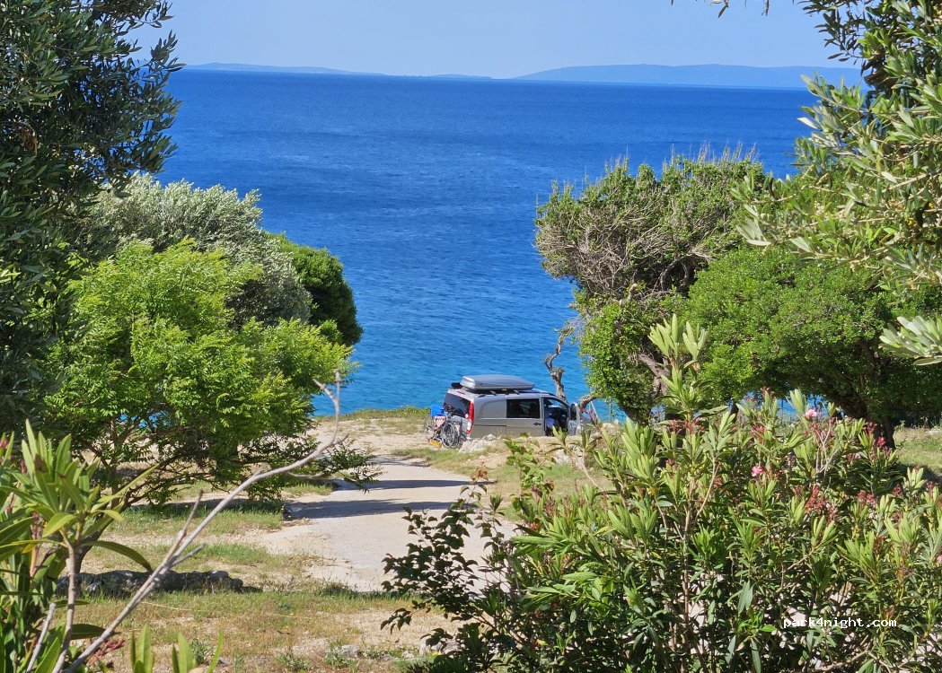 Prendre le chemin de cailloux de 900 m et vous voila dans un petit coin de paradis. Il ne vous reste plus qu'a profiter de la crique privée, loin de tout, pour une bonne baignade suivie d'un apéro. 105 kuna pour un van et 2 personnes. Idéal pour les fourgons aménagés