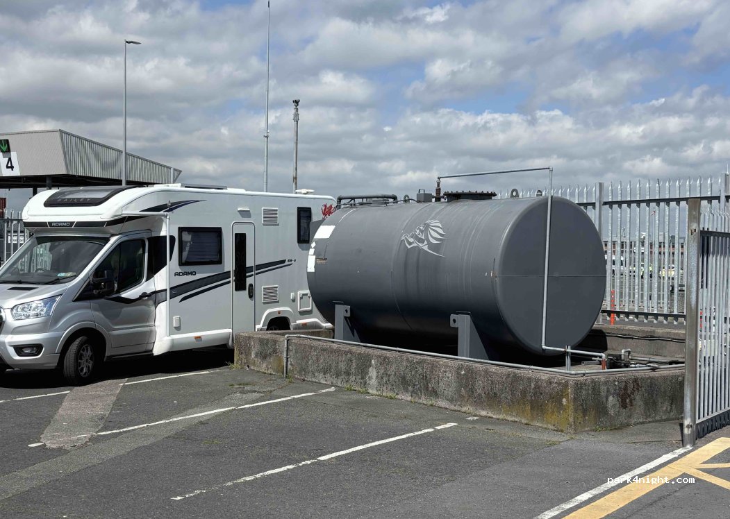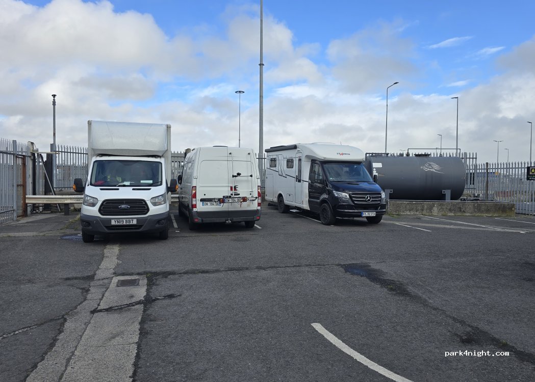 There are 8 larger spaces next to the oil tank in picture, and about 20 car size spaces nearby. We arrived 0800 on a Sunday morning, and there was only one vacant space. We paid for 24hrs parking online (€9), walked into Dublin, got bus back later (€2 pp), and stayed overnight. It was not too noisy - toilets nearby open 24 hrs. Very handy for early ferry departure.