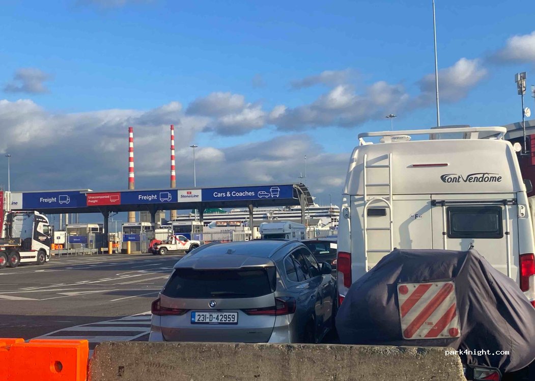Parking at Stena ferry port just near the arrivals/departures. 9€ for the night or 24hrs, just pay at the meter. 24/7 access to very clean toilets. Useful for early ferry out in the morning.