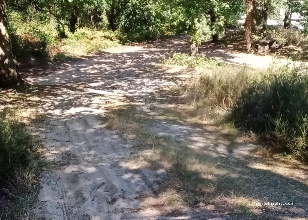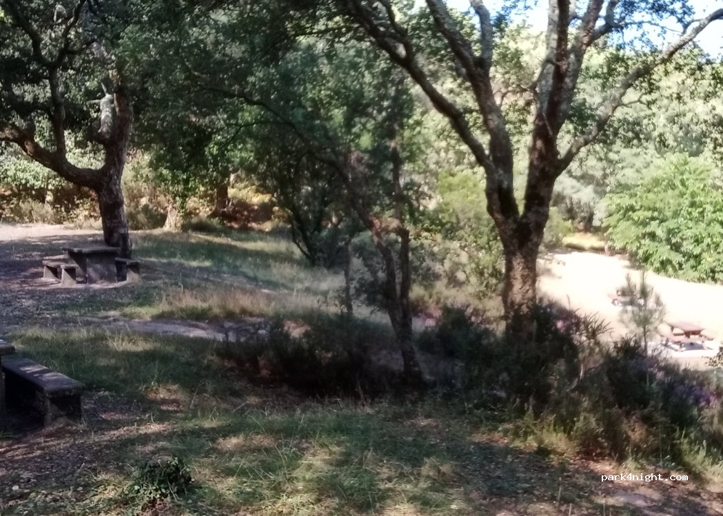 Roadside rest area with picnic tables. Up on the hillside under cork trees. Difficult to access for normal vehicles. The street is relatively noisy. We recommend earplugs.