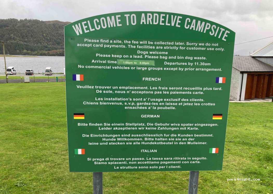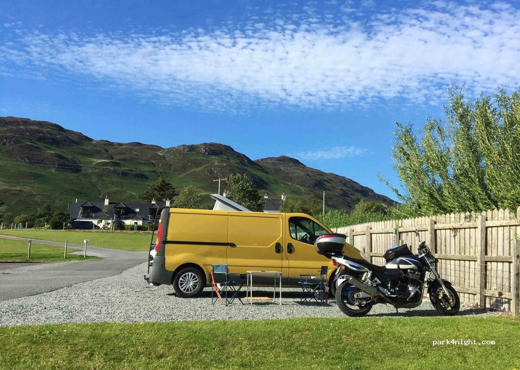 Emplacement incroyable avec vue sur le loch et proximité avec le Eilean Donan castle mais nous n’avions pas de cale pour le van donc nous avons dormi penchés. La propriétaire a été à l’écoute malgré notre anglais très moyen et nous avons pu réserver par téléphone à 18h pour 18h30. Sanitaires propres mais douche payante. Petit plus pour la pizzeria situé dans la même rue. Emplacement 31£ un peu cher