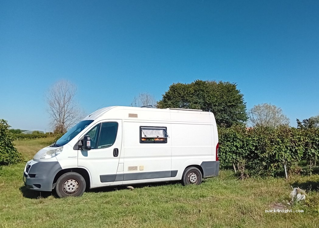 Idyllic little farm with many different animals (ponies, dogs, cats, chickens, rabbits, bees, insects of all kinds...) and a very nice host who speaks German and Englisch, has lots of good tips for the area and his mom, who likes to speak in Italian and bring apricots or blackberries. There is a mini pool to cool off in and you can rend bikes and rickshaw. The bathroom is very modern and clean. By the nearby river there is a nice beer garden with delicious foccacia. There are various small specialties to buy, such as eggs, honey, jam, wine, vinegar and olive oil. A trip to Mantua is recommended and it is half an hour from Lake Garda or Verona.You park in the field, little shade for the summer, sometimes music coming from the restaurant on the river.