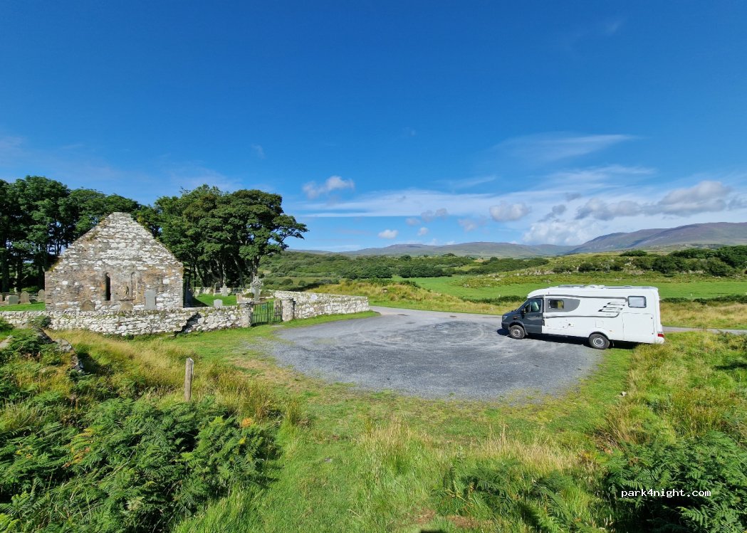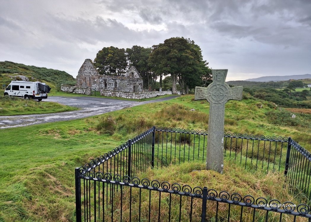 Kein Übernachtungsparkplatz neben der Kildalton-Kirche, wo Sie das wunderschöne Kildalton-Kreuz bewundern können. Das Parken ist bequem und flach. Um dorthin zu gelangen, ist die Straße eine schmale, einspurige Straße mit wenigen Überholmöglichkeiten.