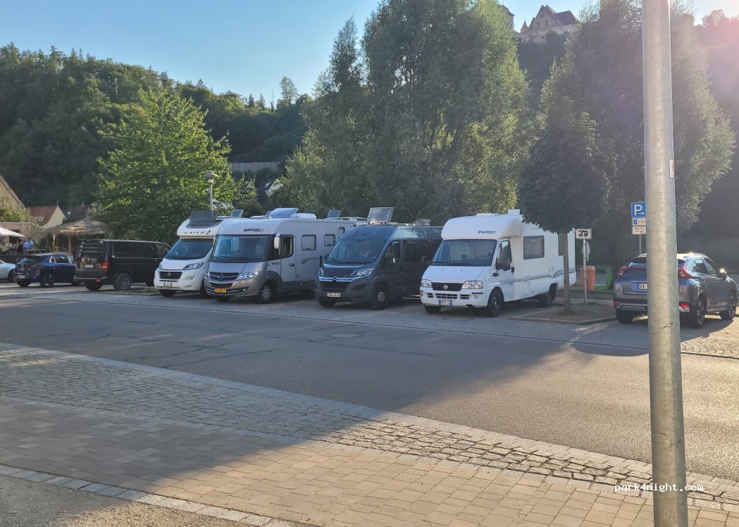 Good free park up close to Harburg Castle & town. Spaces quite small but we fitted our 6.7m motorhome in ok. 3 free spaces when we arrived late Sunday afternoon, 2 quickly taken but one remained free. Another motorhome parked further down in car area, next day cars parked in vacant motorhome spaces. On main road,not too noisy at night but need earplugs as church bells ring every 15 minutes!