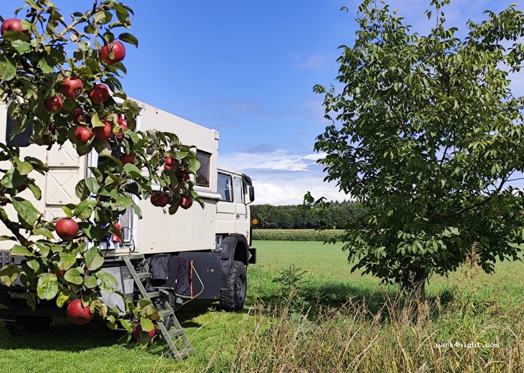 Ein sehr ruhiger Stellplatz mitten zwischen den Apfelbaumreihen und den Rabarberfeldern. Der (sehr freundliche) Besitzer hat jeweils an geeigneten Stellen den Rasen freigemäht. Am 4-eckigen Holzgestell gibt es einen Briefkasten, in dem man eine kleine Spende (wer mag) einwerfen kann. Wir fanden es sehr schön und ruhig dort, würden definitiv wieder kommen. Vielen Dank! ♥️