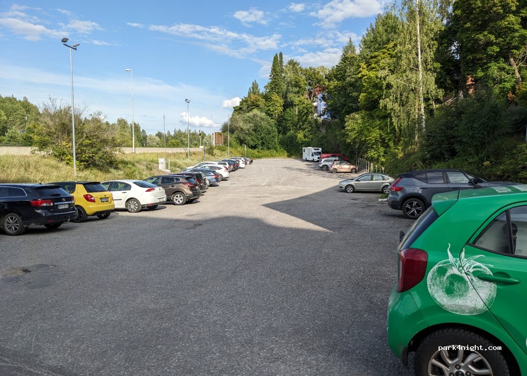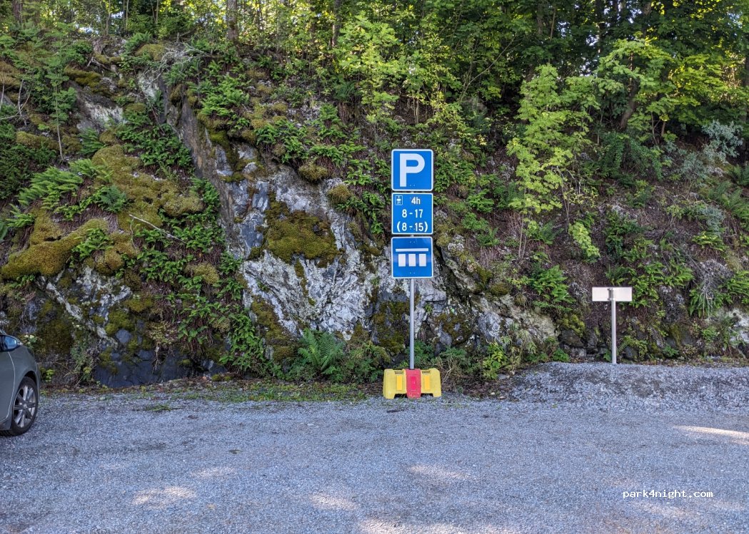 Large gravel parking area very close to town, 4 hour free parking with disc, popular spot but many places