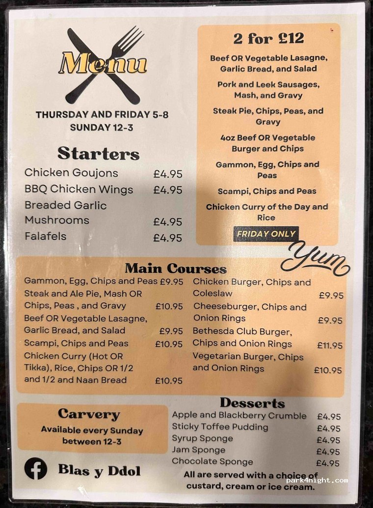 Excellent stopover. £10 pn payable to Wayne in the Clubhouse when it’s open. If not, there’s a black honesty box on the gate. The bar is a great place to call in for a drink. They also serve food on Thursdays, Fridays and Sundays (carvery). See attached photo of menu. Some nice walks from the park up, including along the River Ogwen.