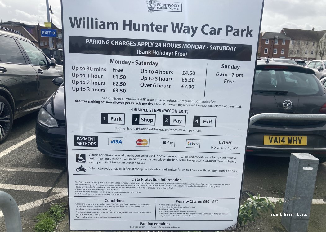 Large town centre car park, William Hunter Way car park. No restrictions 24/7. Machine only takes coins ( you can pay by card over phone or App).