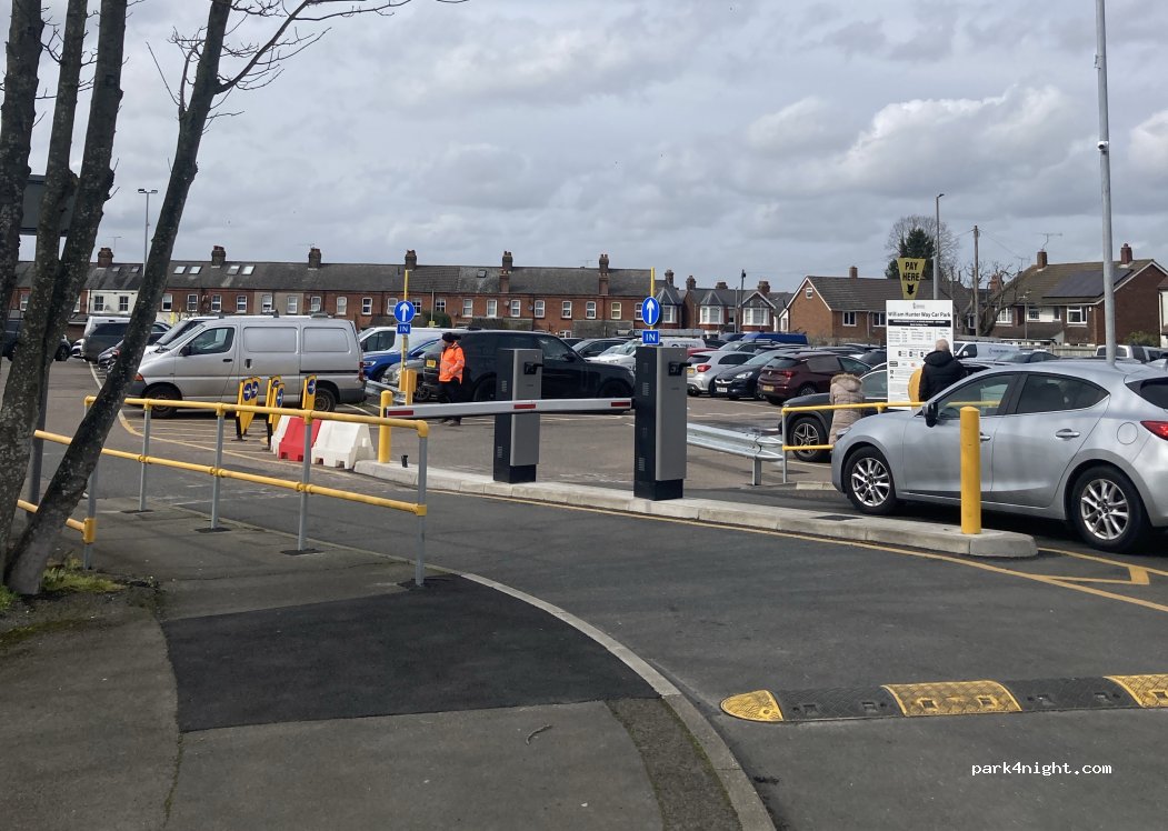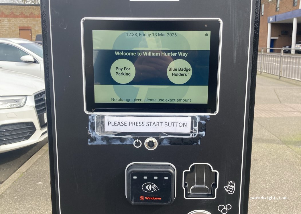 Großer Parkplatz im Stadtzentrum, Parkplatz William Hunter Way. Keine Einschränkungen rund um die Uhr. Der Automat akzeptiert nur Münzen (Sie können per Telefon oder App mit Karte bezahlen).