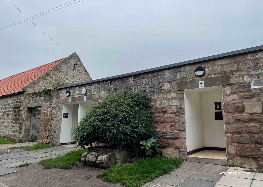 Clean 24 hour toilets, only cold water taps but hand dryer. No charge. Great facility for a visit to Bamburgh. Thanks