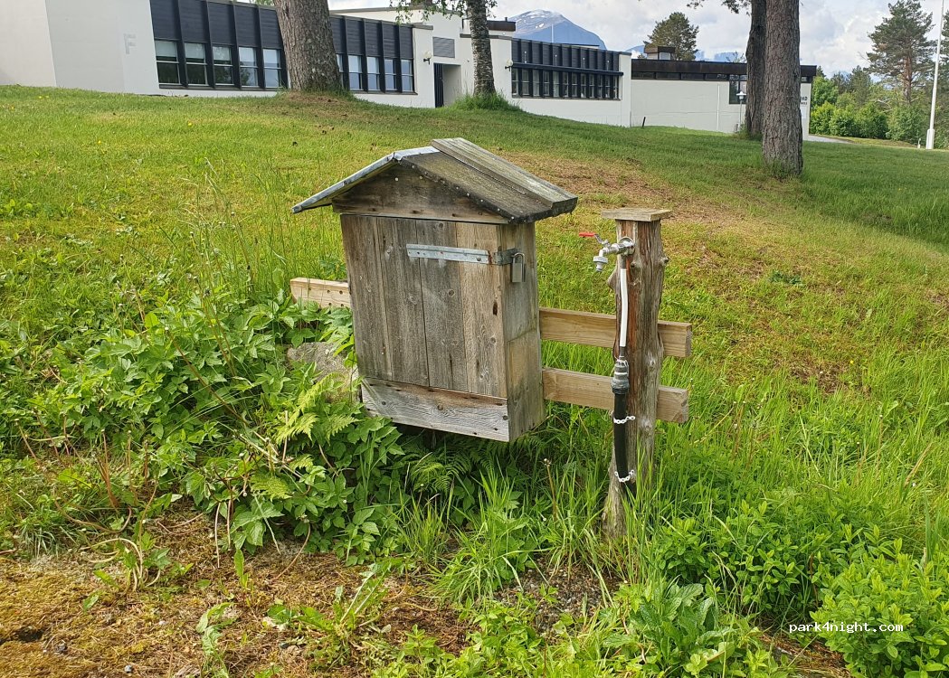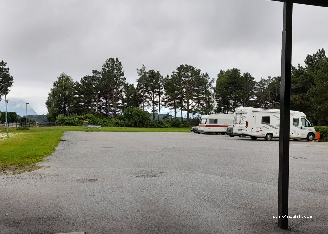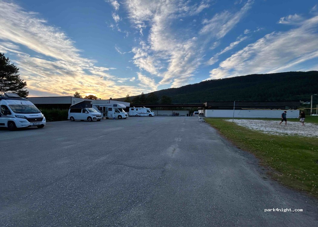 situe à 16 km d'Alesund, très bien calme, 330 NOK pour une nuit avec van, électricité et douches incluses. Pas de possibilité pour vidange eau grises et wc. possibilité de réserver par internet (recommandé car peu de places) Sanitaires très propres, douches collectives (car vestiaires de la salle de sport du collège).