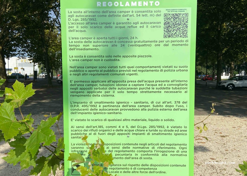 Ho trovato quest'area di sosta perché, ho avuto bisogno del gommista ed essendo domenica necessitavo, di un posto per passare la notte. Soltanto 4posti con accesso acqua e corrente elettrica a pagamento . Possibilità di scarico ma soltanto per le acque reflue. X Le acque nere( WC) non è previsto scarico. Zona tranquilla a ridosso dei centri sportivi. Bar a 50 mt. Ciclabile che porta in città