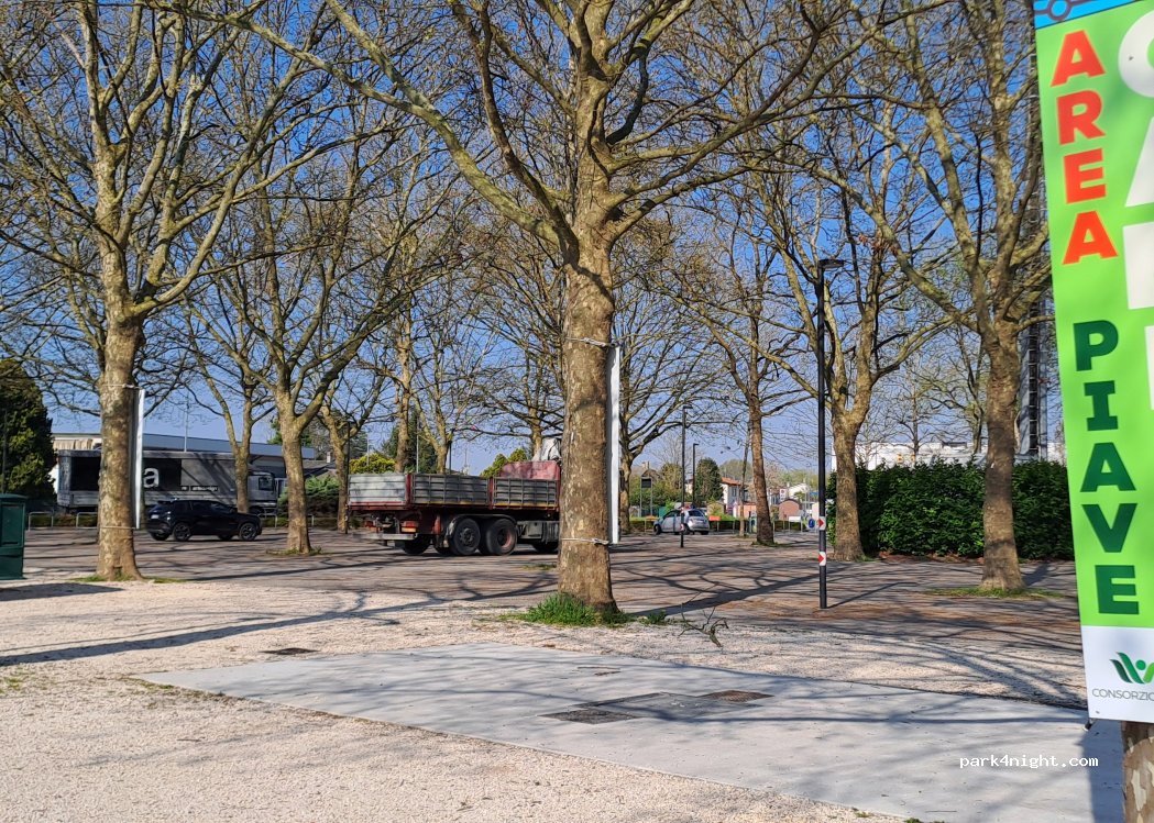 Buon posto di sosta gratuito, gestito dal comune. Molto ombreggiato con bar nelle vicinanze. ci sono solo 4 punti luci a pagamento. Possibilità di scarico acque nere a pagamento, gratuitamente lo scarico delle delle acque grigie. Buon posto da utilizzare come base da utilizzare per visita alla città e nelle vicinanze l'accesso al percorso ciclopedonale lungo le sponde del Piave.