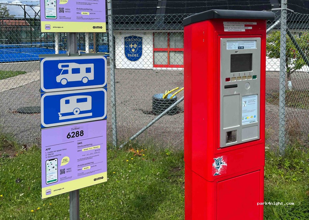 Bra parkering. Nära till restaurang och bad. Ingen el. 200kr för 24 timmar.