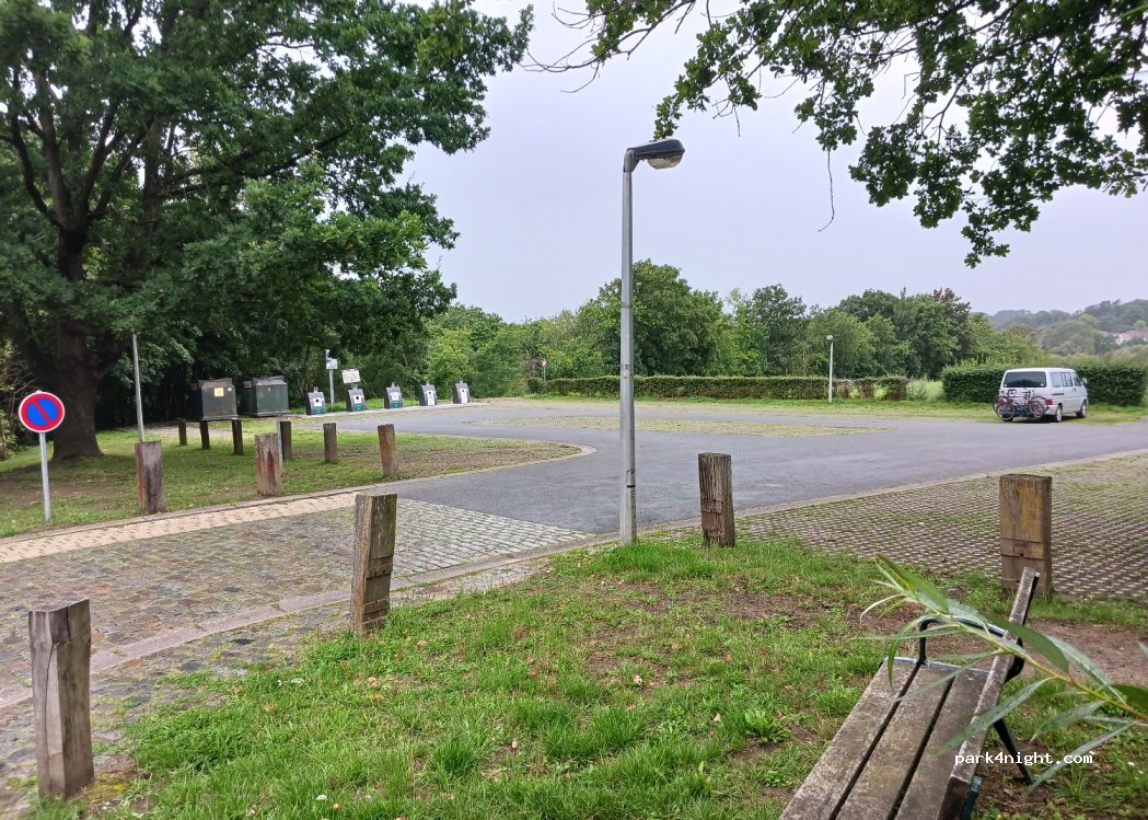 Parkplatz des Sportvereins, ohne Schranken, ohne Annehmlichkeiten, gut für Transporter, auf diesem Parkplatz gibt es Glascontainer, aber wenig Verkehr, eine Straße darunter mit mäßigem Verkehr.