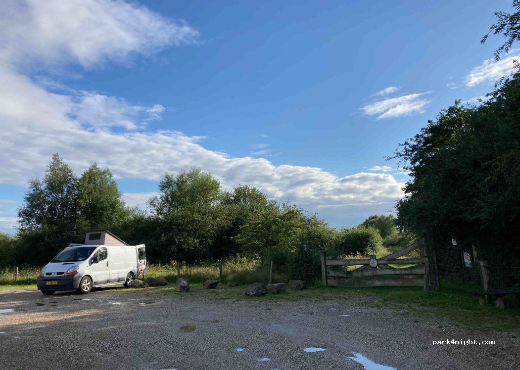 Kleine parkeerplaats met effen grind bodem met parkeervakken tussen stenen waar kleine busjes tussen passen. Plek voor één grote camper. Geen voorzieningen. Toegang tot natuurgebied rondom voormalige grind-afgraving. Parkeerplaats ligt langs doorgaande provinciale weg waar overdag wel wat regionaal verkeer langskomt . Vanavond bezoek van politie die na een inschattend kijkje en praatje toestemming geeft tot overnachting op deze plek. :-)