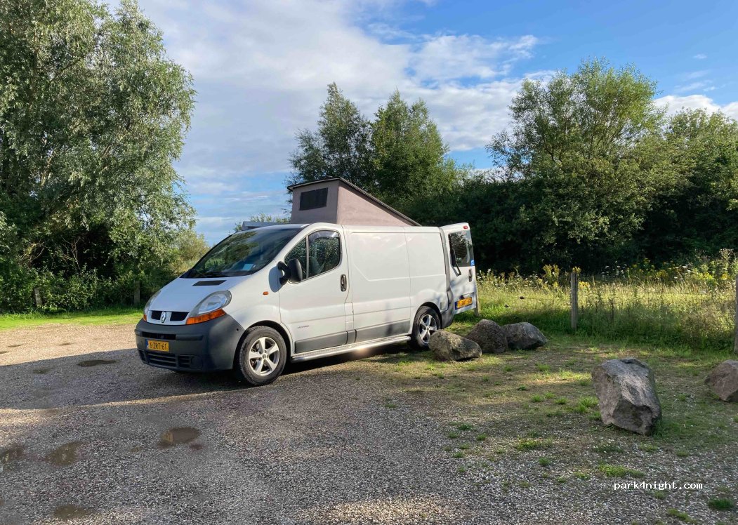 Petit parking avec sol en gravier lisse avec des espaces de stationnement entre les pierres où les petites camionnettes peuvent s'adapter. Place pour un grand camping-car. Pas de commodités. Accès à la réserve naturelle autour de l'ancienne excavation de gravier. Le parking est situé le long d'une route provinciale principale où passe une partie du trafic régional pendant la journée. Ce soir une visite de la police qui, après un coup d'œil estimé et une discussion, donne l'autorisation de passer la nuit à cet endroit. :-)