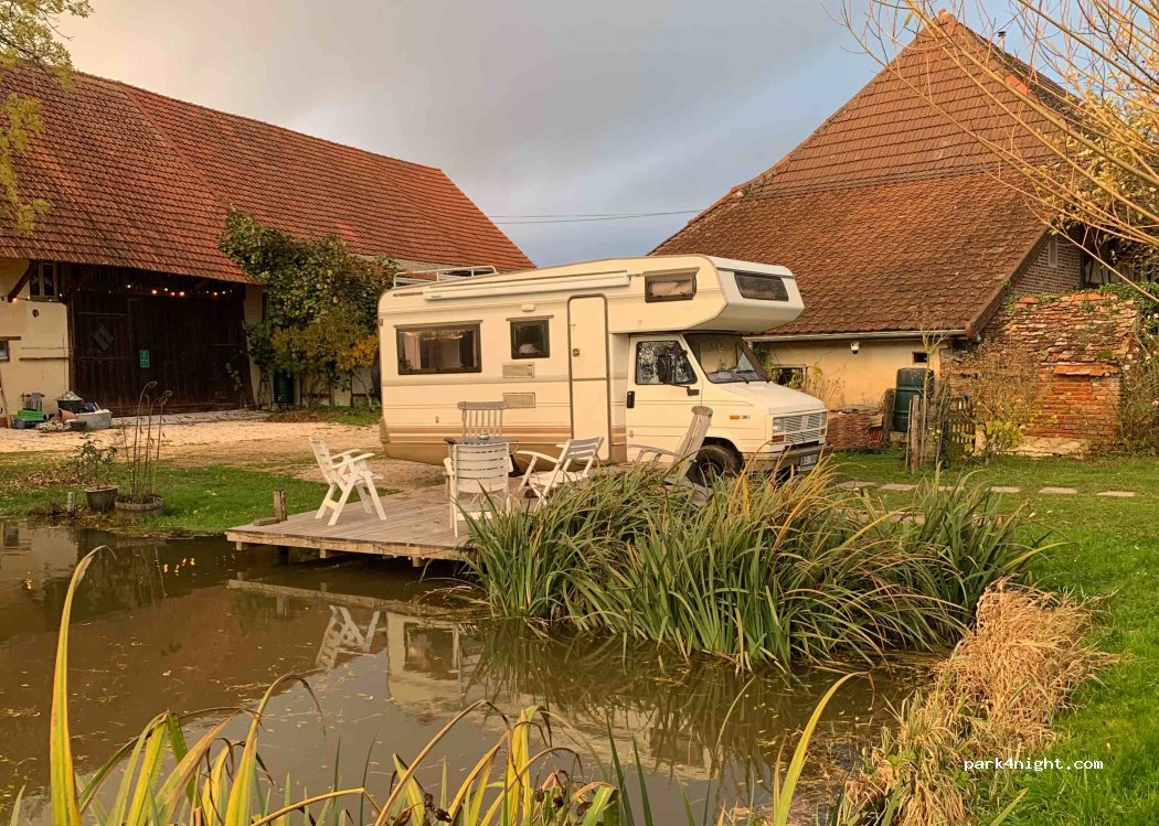 Wo kann man mit seinem Camper direkt an einer Terrasse an einem kleinen Teich stehen? Hier geht’s! Sehr nettes Pärchen und ein sicheres, einmaliges Plätzchen. Es gibt viele Tiere, die alle sehr lieb sind. Die beiden Hunde sind recht groß und gehen auf Kontaktsuche. Sind auch lieb, also kein Problem, aber das ist vielleicht nicht für jedermann etwas.