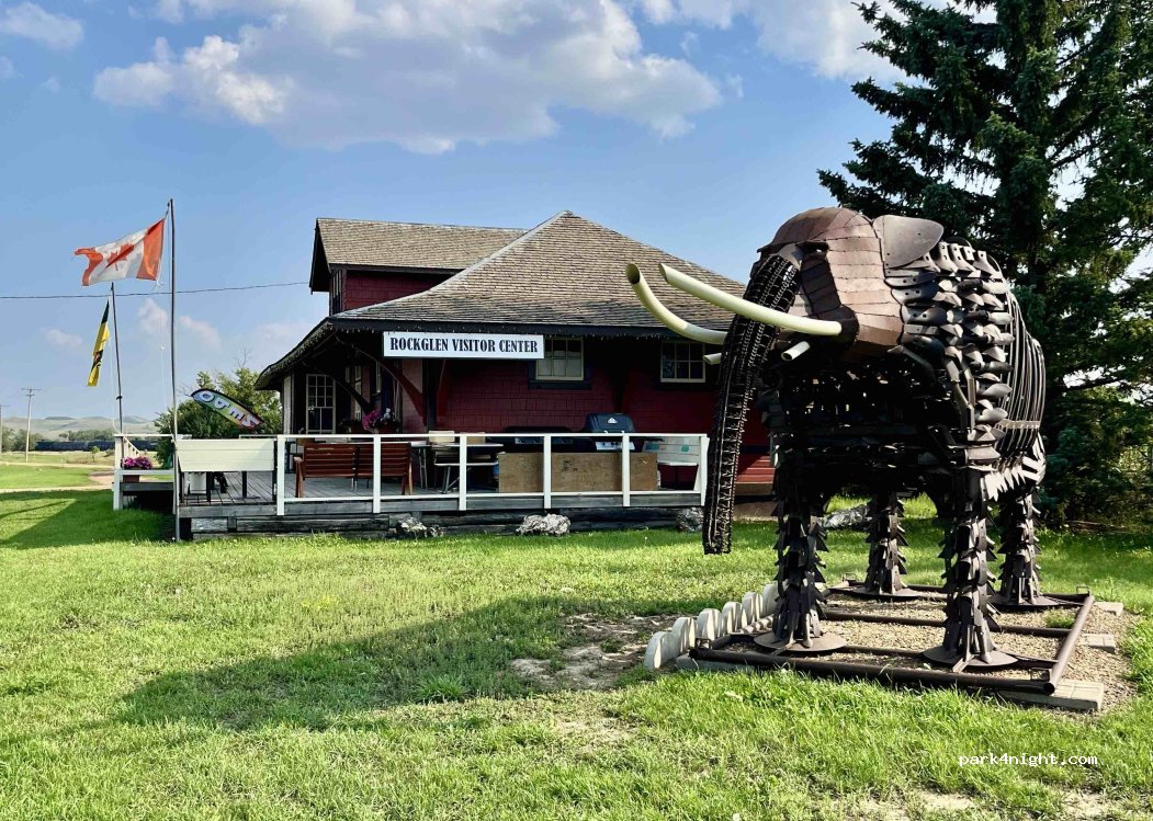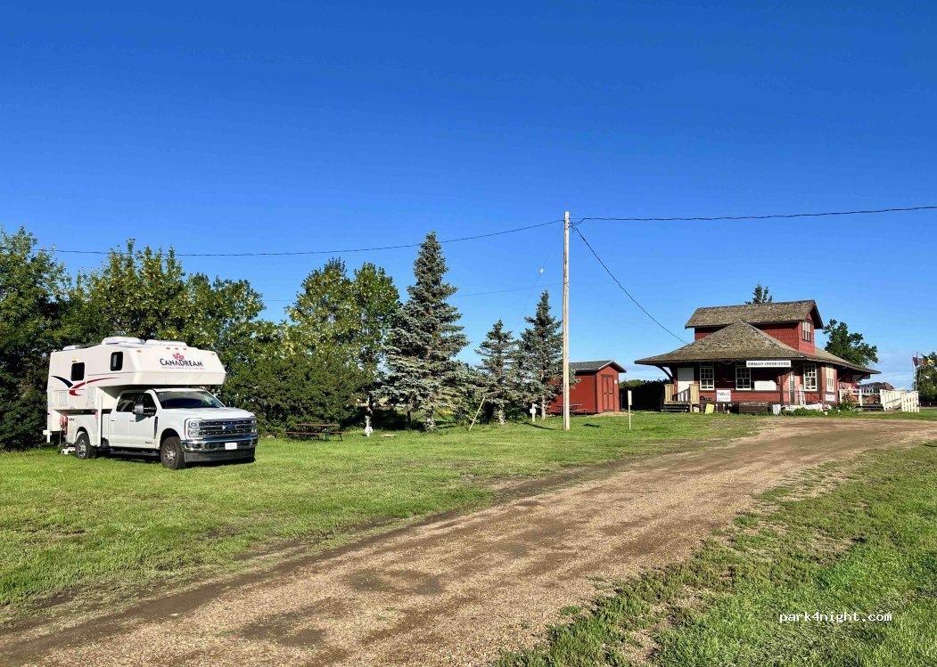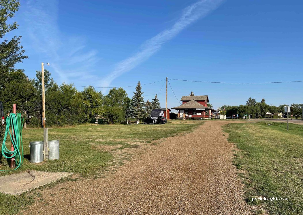 Excellent stopover last night. Converted railway station and tourist office. Paid CAD $15 for a pitch with city water supply and waste drain no electricity. Has very clean bathroom with shower, toilet and basin. Water hot. Also has washer 30 mins and dryer 45 mins for no extra charge so very happy. Thankyou Rockglen