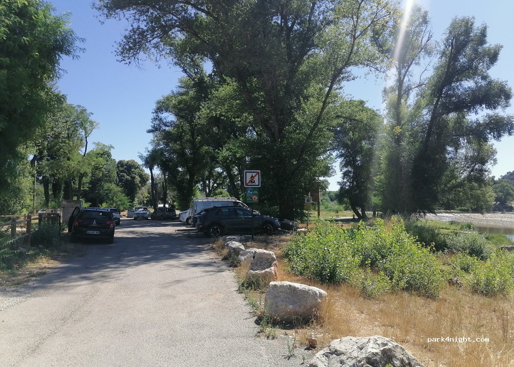 Parking avec barre à 2m30, entre le verdon et l'aire payante de cc. Teste l'an passé et redormi cette nuit : tkl, aire de jeux, aire de sport, tables de pique nique, WC turque à 2 min en empruntant l'ancienne route le long du verdon.