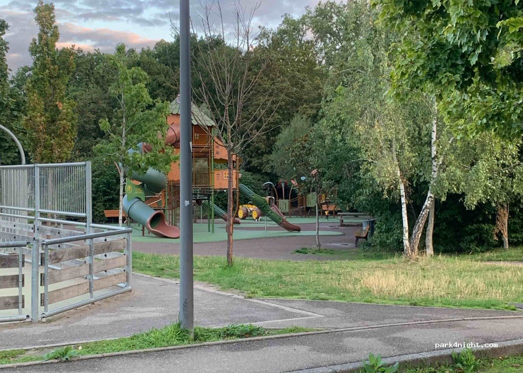 Nur für kleinere Fahrzeuge. Normales Wohnmobil mit gerade eingebautem Fahrradträger. Viele Spielplätze für Kleinkinder und Nutztiere im Parc Friedel (nur nachmittags geöffnet). Trinkwasserbrunnen und -behälter. Verkehrslärm (und Kinderlärm).