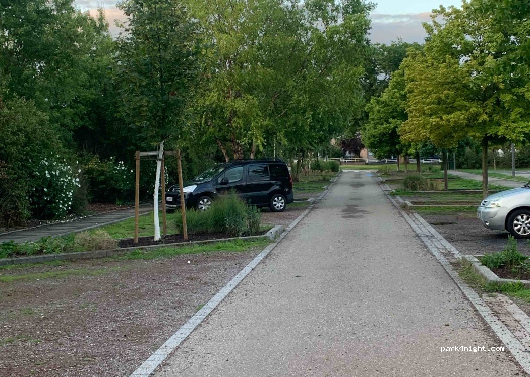 Only for smaller vehicles. Regular campervan with bikerack just fitted. A lot of playgrounds for little children and farm animals in Parc Friedel (only open in the afternoons) . Drinking water fountain and bins. Traffic noise (and children noise).