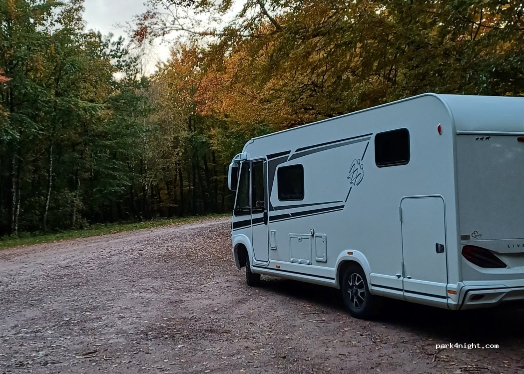 Endroit magnifique au bord de la forêt. Emplacement pour un ou deux vans avec des tables et un grill à proximité. Bon réseau 4G.
