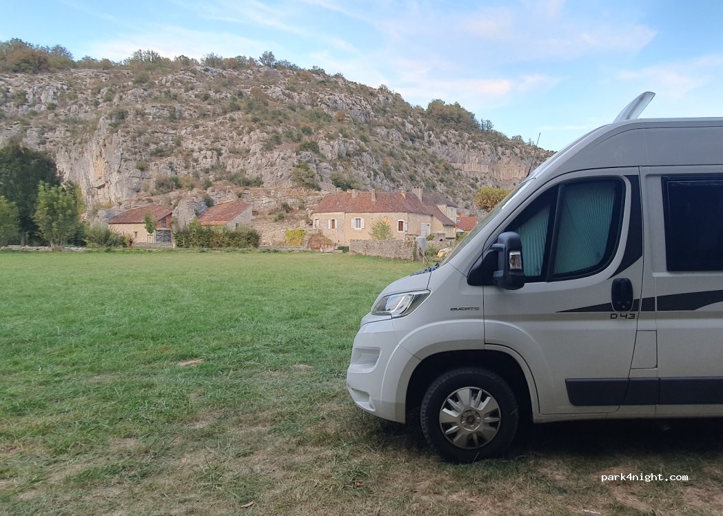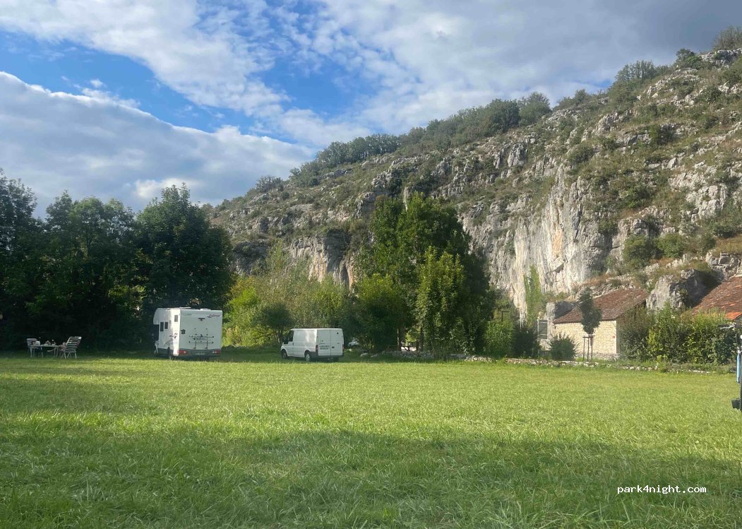 Une grande étendue d'herbe plutôt plate à l'entrée d'un charmant village, avec petite aire de jeux et terrain de boules juste à côté. Un petit ruisseau (amenant quelques moustiques), une belle vue, un chouette coin de baignade dans le Célé à 10min de marche... pour 6e la nuit ! Merci à la municipalité ! Le hic en cette saison c'est le manque d'ombre... Cloches de l'église de 7h à 22h.