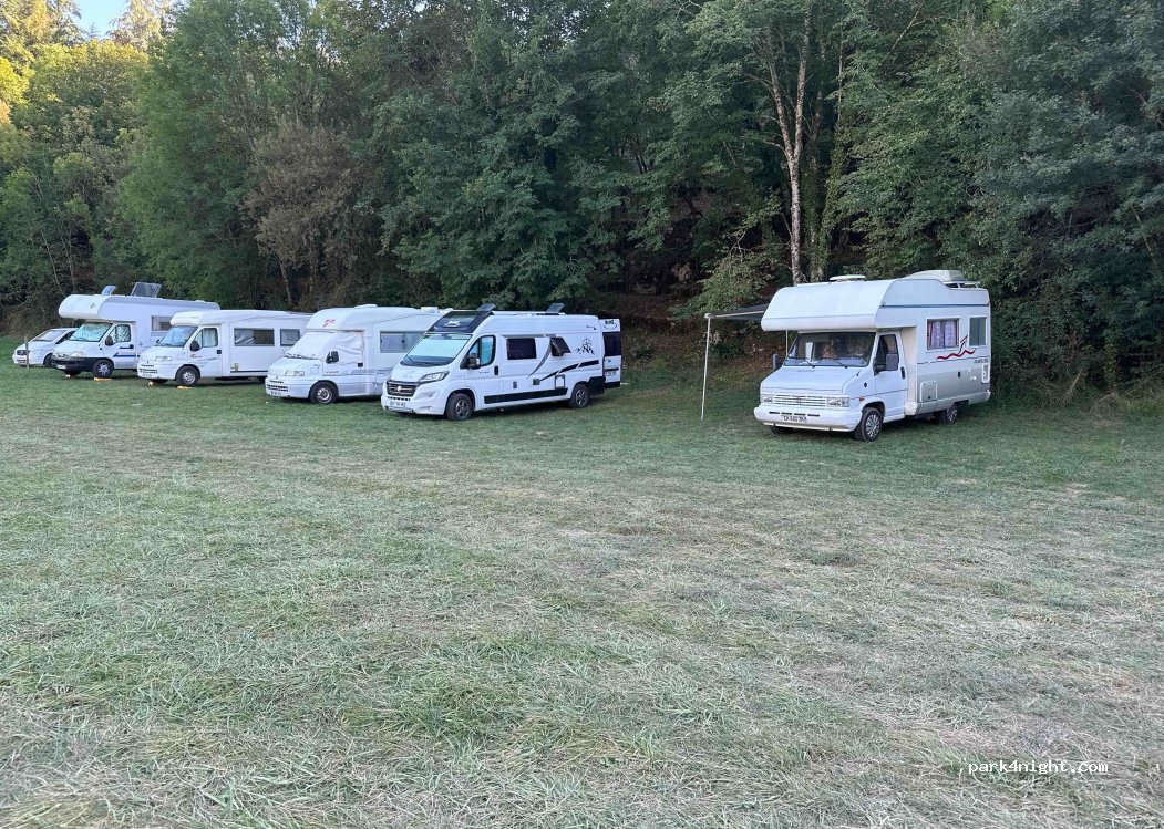 A large meadow where the town has 200 parking spaces (according to the sign). Tonight, there are barely ten of us. Parking is set back from the road, with all the shops nearby. A pétanque court and another parking lot reserved for cars.