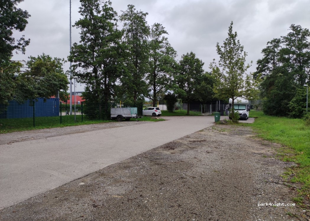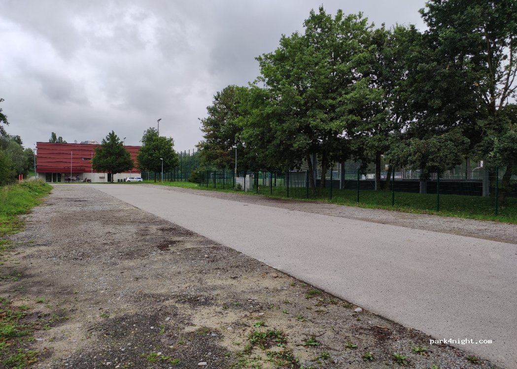 Großer Parkplatz an der Bowling- oder Sportanlage. man hört die Straße nebenan.