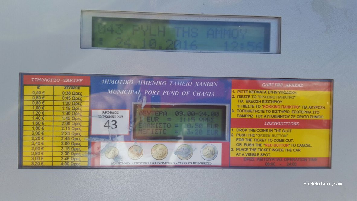 Chania paid city parking at the seaside 10 minutes walk from the port and the center. Easy access and no problem to find room in the morning. The 2nd picture is the full price.