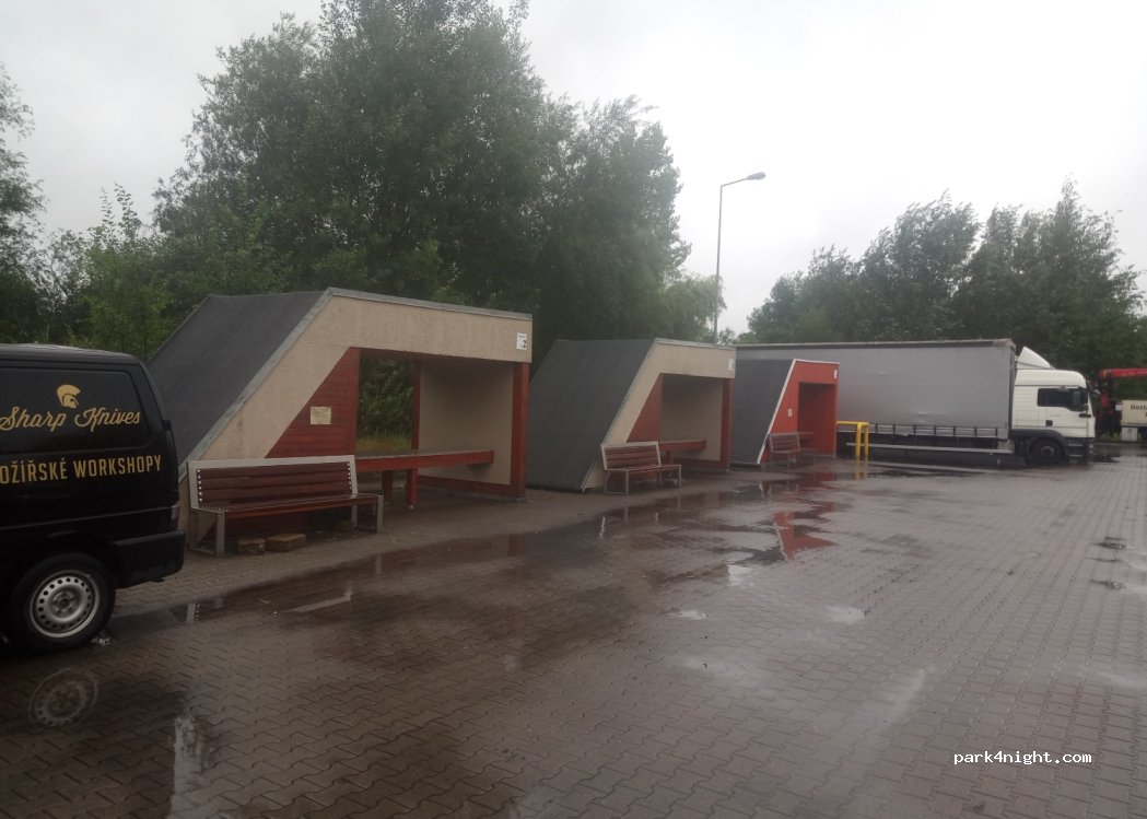 Parking przy drodze. Głośno od aut. Na miejscu WC i parę zadaszonych kiosków. To raczej postój dla TIR.