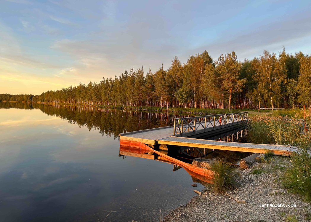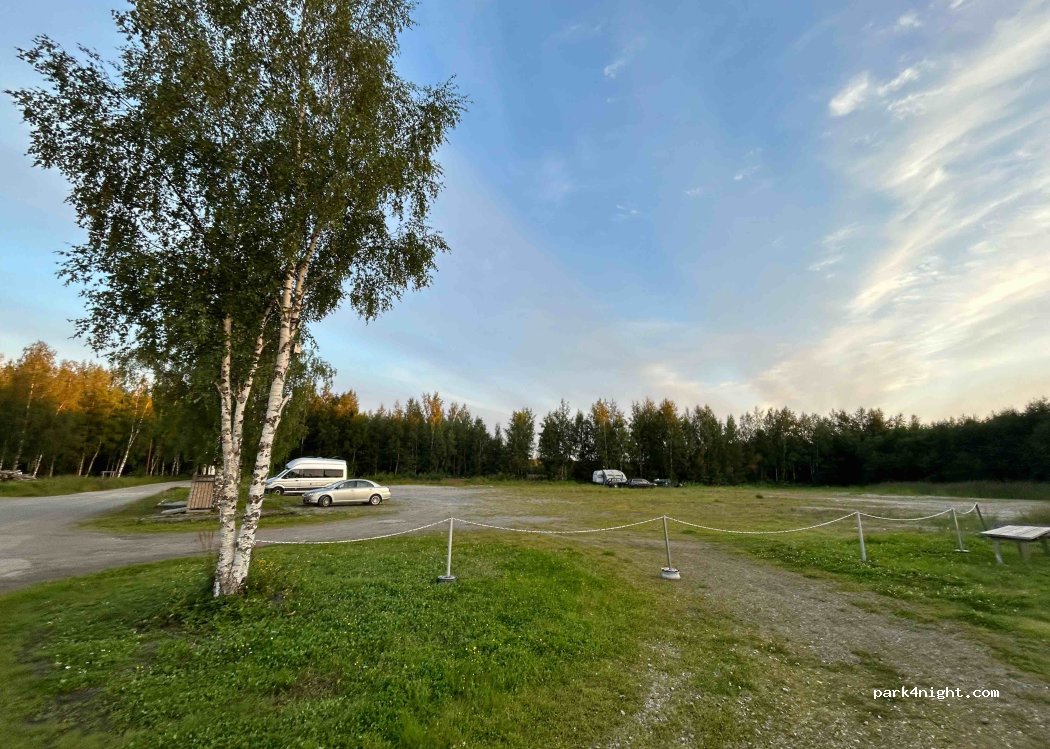 Grand grand parking près du lac. Pas de limitation de hauteur, accès sur route non goudronnée (mais agréable). Baignade en lac, aire de pique-nique avec feu et fumoir, pêche possible (QR code pour carte payante au bureau d'information sur place). Bel endroit