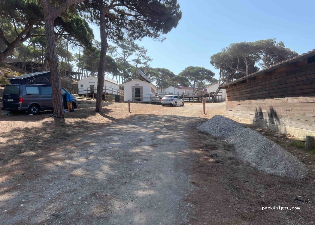 Solo parking con derecho a duchas, cocina y wc, bastante sucio por cierto. Sin mas servicios. 15€. Algunas muy buenas sombras si pillas el sitio. Zonas mas niveladas y otras peor. Si vas con niños puede estar bien, x su parque infantil y su cafetería/tienda con casi de todo. A 15' de la playa andando. Conexión de tranvía y bus cerca para subir a Sintra.