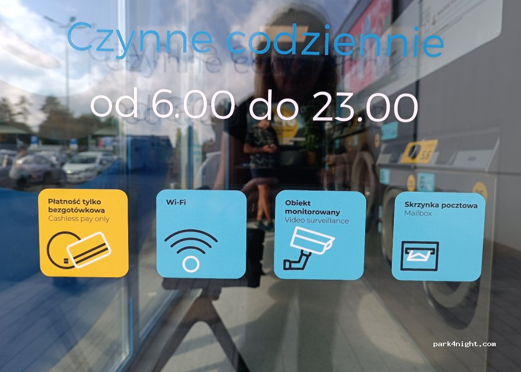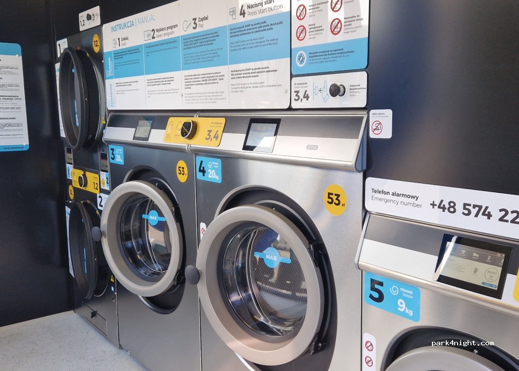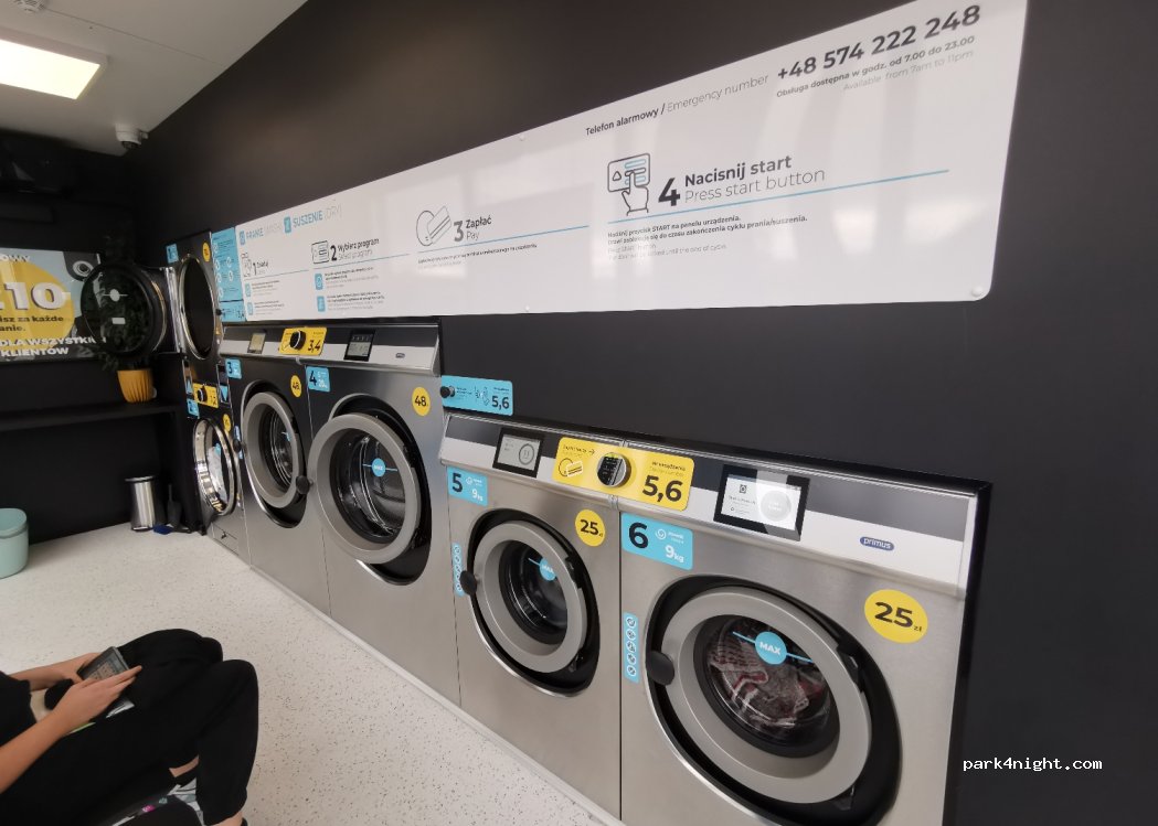very practical right in the parking lot at Kaufland. There are 2 washing machines of 9 kg each (28 zlotys) and 2 larger ones of 20 kg each (53 zlotys). and 2 dryers of 12 kg (12 zlotys -15 min). For parking you have to get a ticket from the machines even though the first 2 hours are free